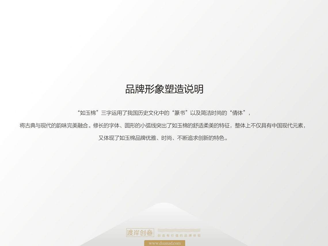 LOGO运用了我国历史文化中的“篆书”以及简洁时尚的“倩体”,将古典与现代的韵味完美融合。修长的字体、圆形的小弧线突出了如玉棉的舒适柔美的特征,整体上不仅具有中国现代元素,又体现了如玉棉品牌优雅、时尚、不断追求创新的特色。